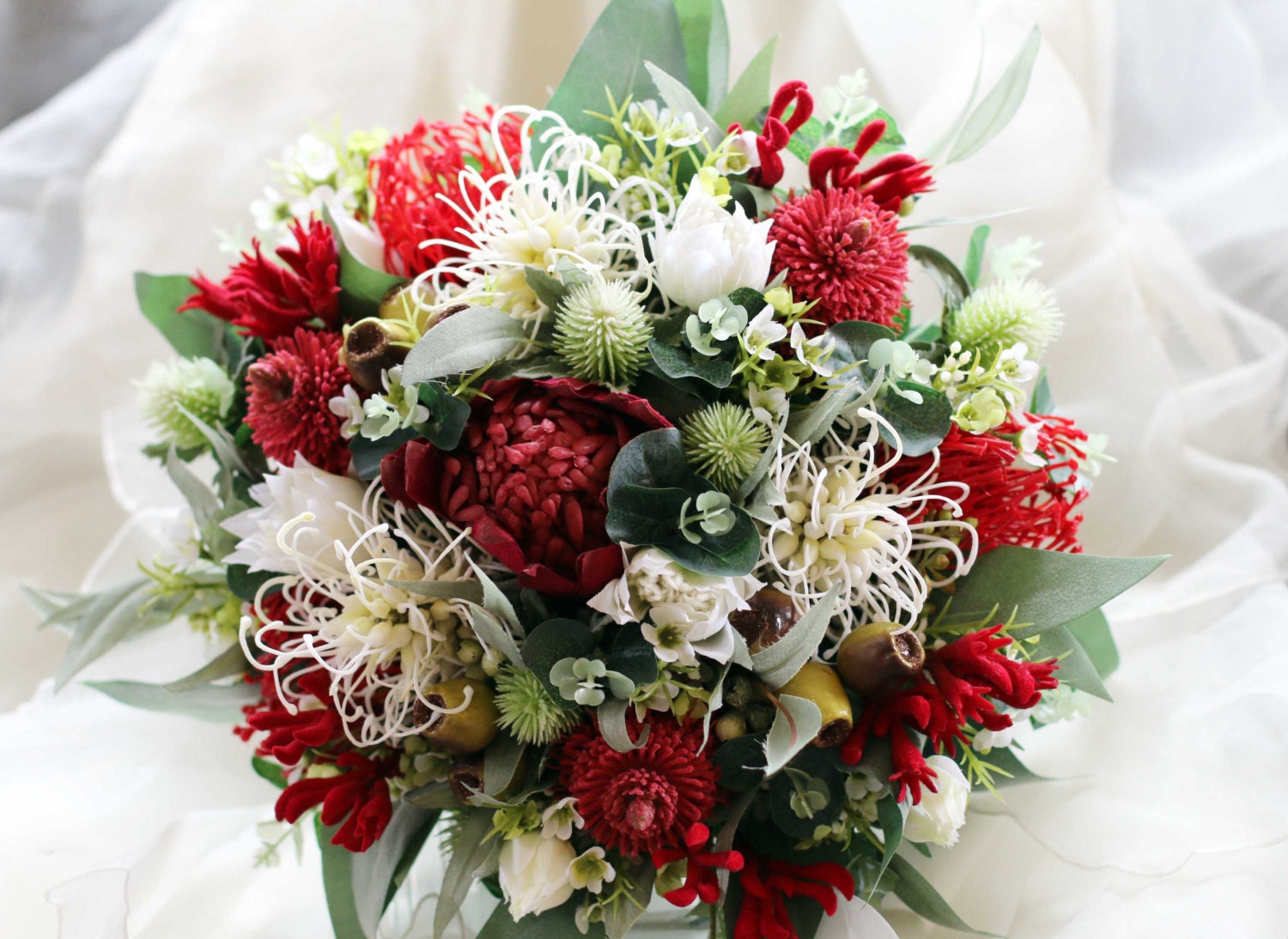 Red and white Australian native rustic bouquet. Wedding | Etsy